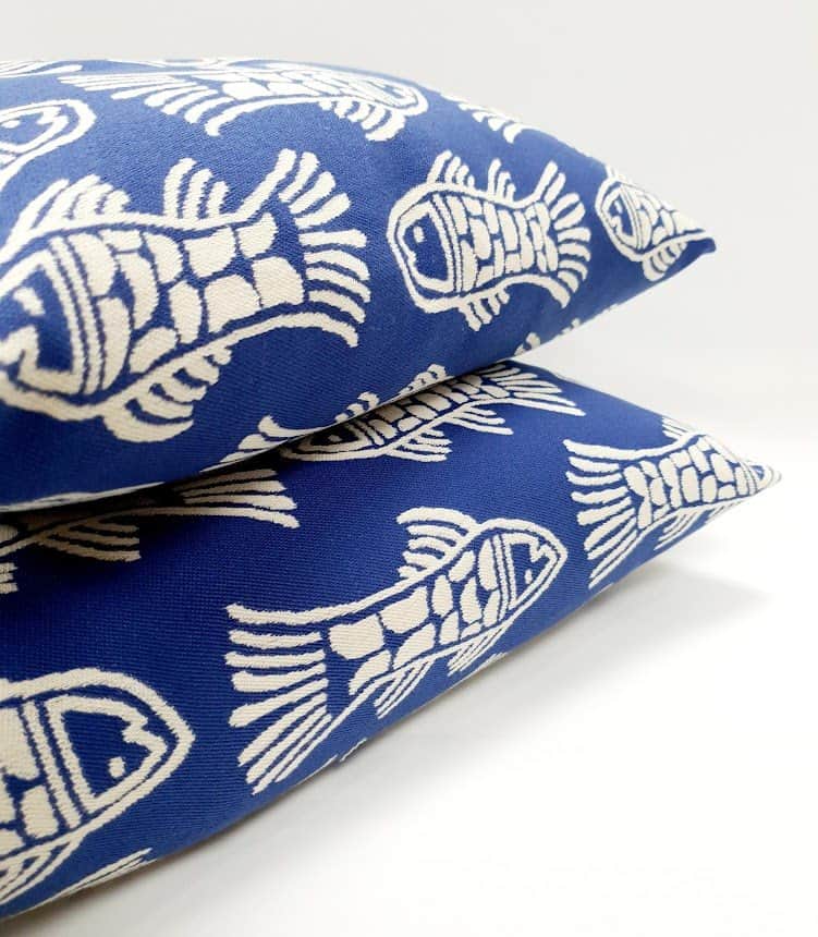 סגנון: וינטאג', קלאסי, אירופאי. כרית נוי לסלון דגים כחול לבן מתאימה לשימוש חוץ